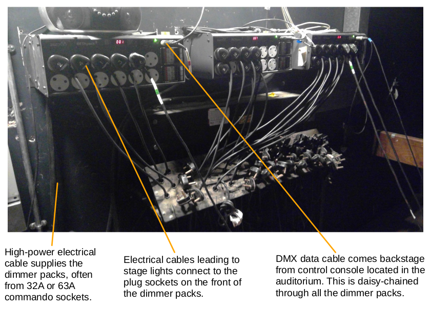 One will recall from Hardware 2: Introduction to DMX Control, that most modern theatrical equipment now communicates over the DMX protocol. This includes dimmer packs. One will also recall that DMX allows for dimmer packs to be daisy-chained and controlled over fewer cables than if each channel were directly connected to its own triac control potentiometer.