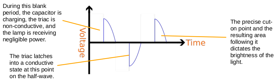 It is important to note the fact that triac-based dimming circuitry only works correctly with an alternating current input. This is because the nature of the mains sine-wave, with its repeated zero crossing points of the horizontal axis (see H1.1 - Mains Electricity Theory of Operation) provides the triac with the requisite momentary lack of voltage across its main two pins which, as discussed above, is the only way in which it can "unlatch".